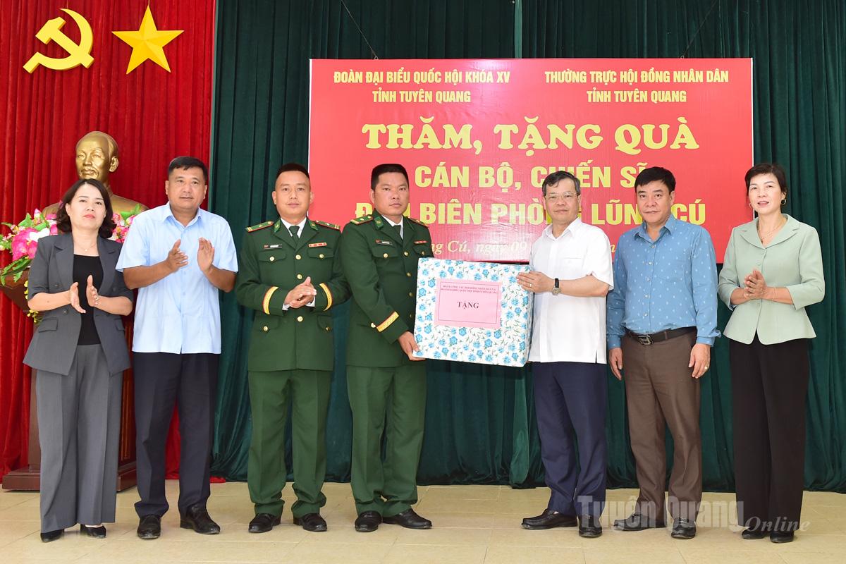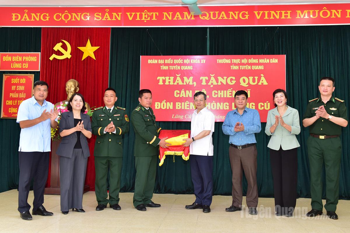 Đồng chí Chủ tịch HĐND tỉnh Nguyễn Văn Sơn cùng các đồng chí lãnh đạo tỉnh tặng quà Đồn Biên phòng Lũng Cú.
