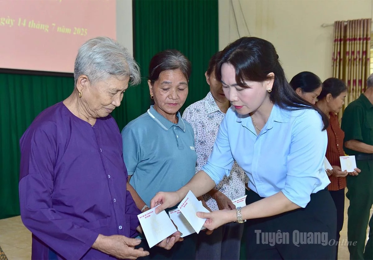 Đồng chí Nông Thị Bích Huệ, Ủy viên Ban Thường vụ Tỉnh ủy, Phó Bí thư Thường trực chuyên trách Đảng ủy UBND tỉnh trao quà cho các gia đình chính sách, người có công trên địa bàn xã Yên Nguyên.