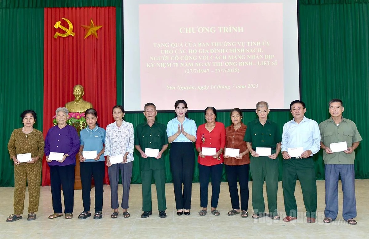 Nhân dịp kỷ niệm 78 năm Ngày Thương binh - Liệt sĩ (27/7/1947 - 27/7/2025), Đoàn công tác số 20 của Ban Thường vụ Tỉnh uỷ đã trao tặng 10 suất quà của tỉnh (mỗi suất trị giá 2 triệu đồng) cho 10 hộ gia đình chính sách, người có công trên địa bàn xã Yên Nguyên. Đoàn công tác cũng đến tham quan một số mô hình kinh tế trên địa bàn xã Yên Nguyên.