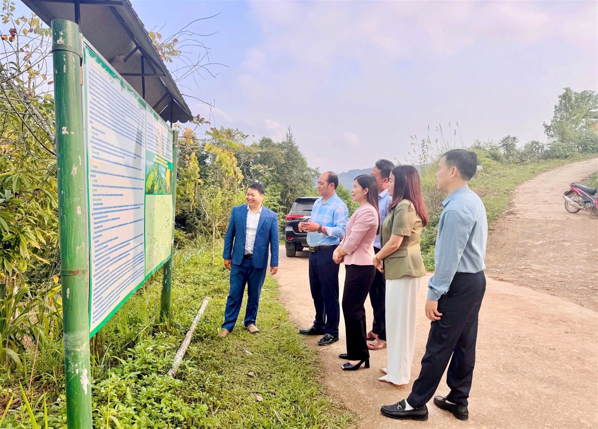 Đoàn công tác tham quan, tìm hiểu thông tin tại bảng giới thiệu mô hình làng du lịch cộng đồng Nậm Hồng.