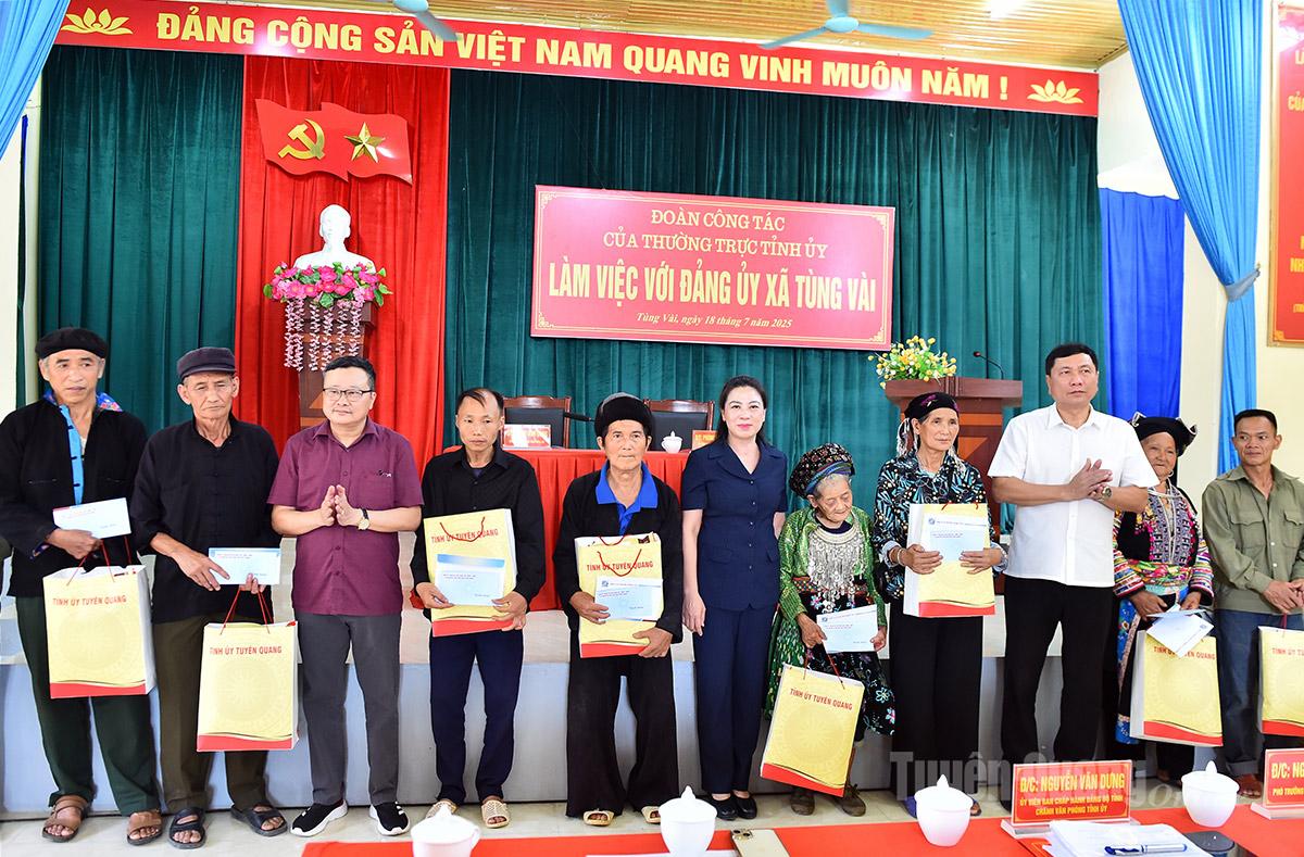 Nhân dịp này, đồng chí Phó Bí thư Thường trực Tỉnh ủy đã trao quà tri ân các thương binh, bệnh binh, gia đình chính sách nhân kỷ niệm 78 năm Ngày Thương binh - Liệt sỹ (27/7/1947 - 27/7/2025); trao quà cho xã Tùng Vài phục vụ công tác bổ sung trang thiết bị làm việc.