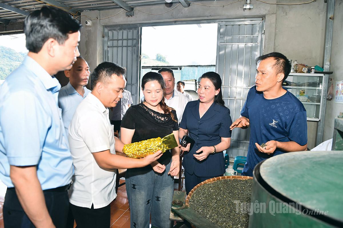 Đồng chí Lê Thị Kim Dung, Phó Bí thư Thường trực Tỉnh ủy thăm mô hình chế biến chè tại thôn Suối Vui, xã Tùng Vài.