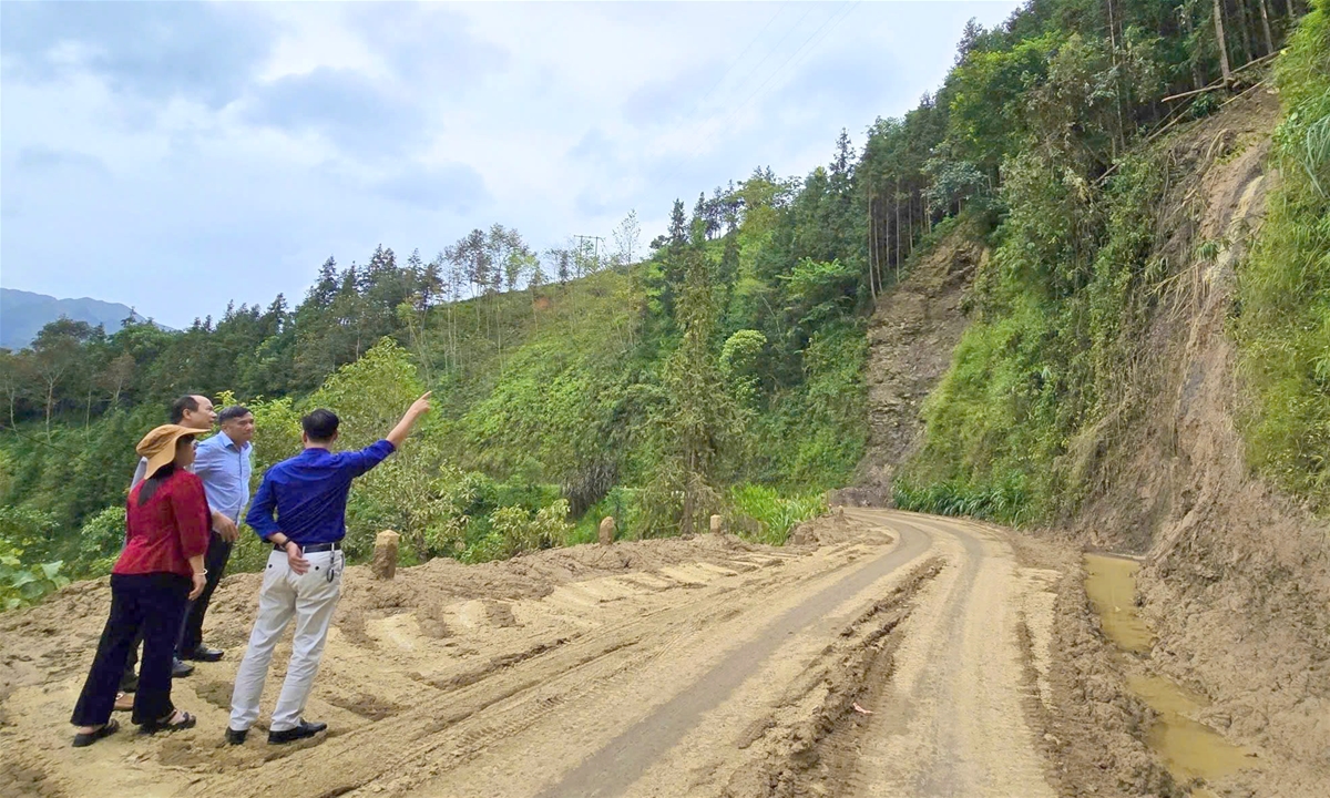Tại xã Thắng Mố, đoàn kiểm tra thực tế các điểm sạt taluy dương trên tuyến đường liên xã, nơi khối lượng đất đá lớn gây chia cắt cục bộ. Đồng chí Hầu Minh Lợi đề nghị chính quyền xã phối hợp với lực lượng công an, dân quân, đoàn viên thanh niên và các đơn vị thi công huy động máy móc, phương tiện để khẩn trương khơi thông, đảm bảo giao thông bước đầu.