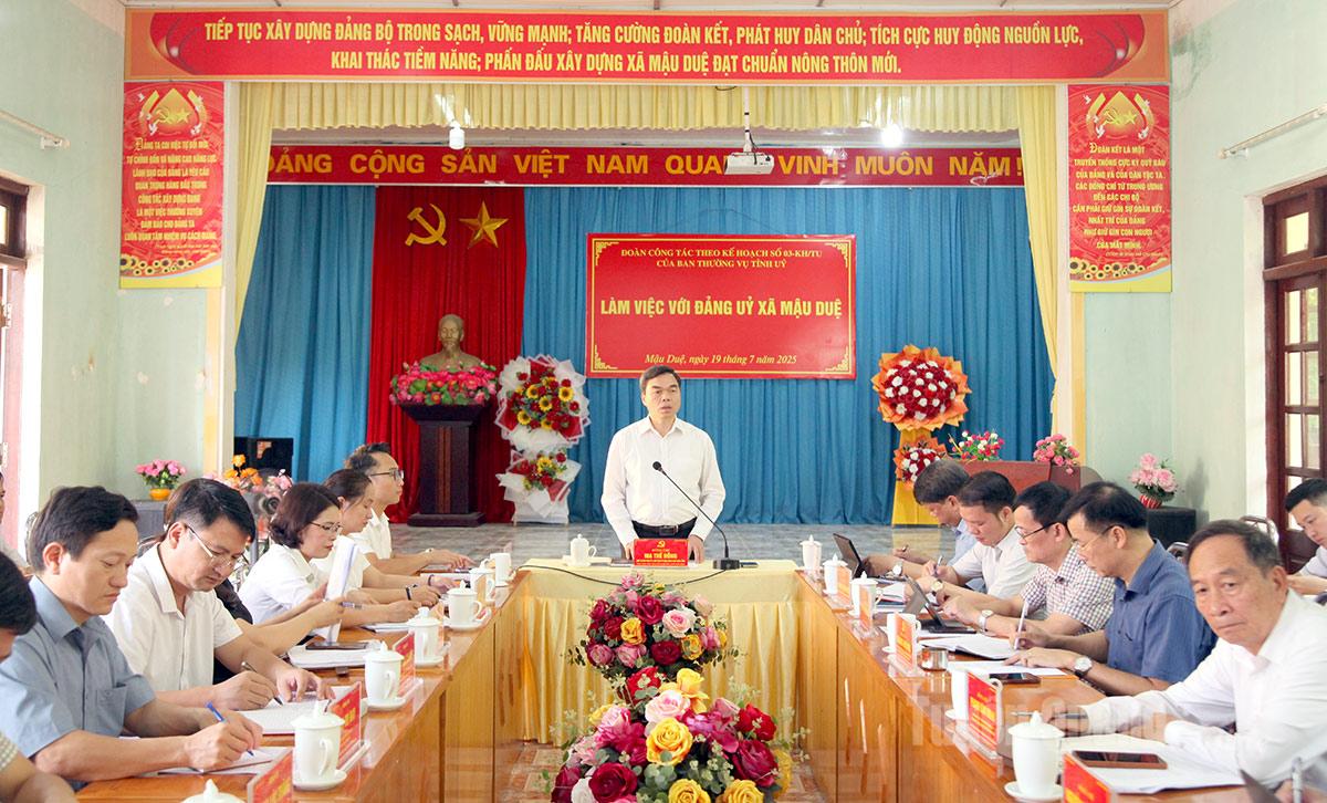 Phát biểu kết luận buổi làm việc, Phó Bí thư Tỉnh ủy Ma Thế Hồng ghi nhận, biểu dương nỗ lực của cấp ủy, chính quyền xã Mậu Duệ đã nhanh chóng bắt tay vào thực hiện nhiệm vụ ngay sau sáp nhập. Đồng chí yêu cầu xã chủ động ổn định tổ chức bộ máy, kiện toàn hệ thống chính trị cơ sở, rà soát lại quy chế, phân công nhiệm vụ cụ thể rõ người, rõ trách nhiệm; đẩy mạnh cải cách hành chính, nâng cao chất lượng phục vụ người dân. Cần chuẩn bị tốt các điều kiện tổ chức Đại hội Đảng bộ xã nhiệm kỳ 2025 – 2030.