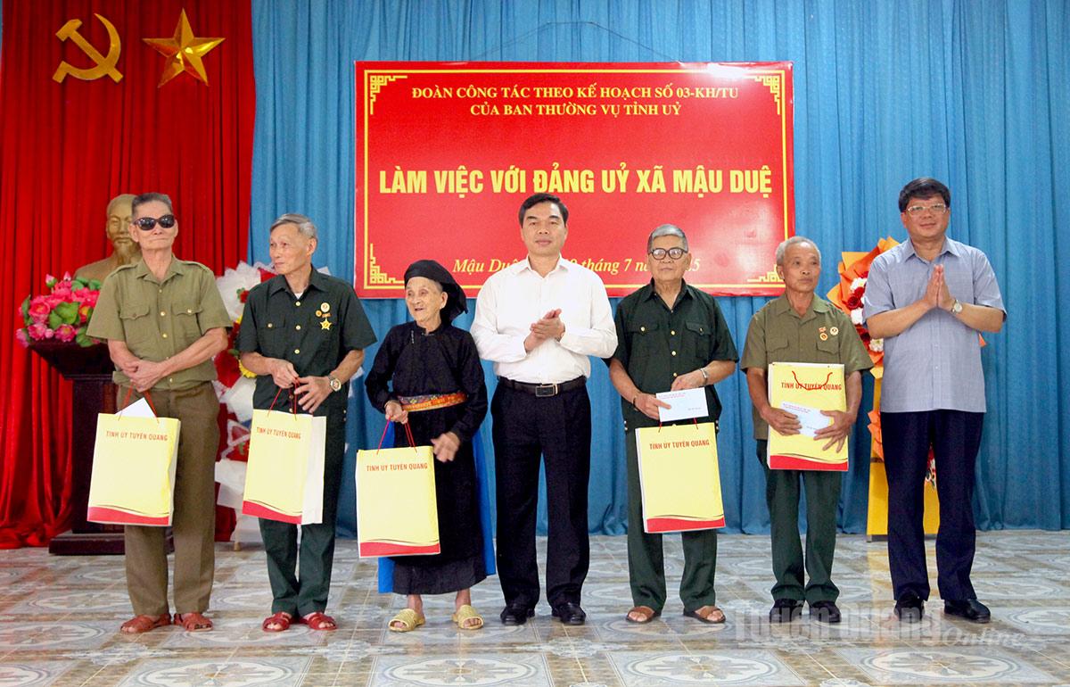 Dịp này, đoàn công tác đã tặng 7 suất quà cho các cựu chiến binh trên địa bàn nhân dịp kỷ niệm Ngày Thương binh, liệt sĩ 27-7 và tặng quà cho xã Mậu Duệ.
