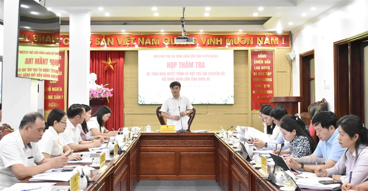 Cuộc họp đã thẩm tra 07 dự thảo nghị quyết gồm 01 nghị quyết thuộc lĩnh vực Nội vụ, 06 nghị quyết thuộc lĩnh vực Tư pháp, cụ thể: (1) Bãi bỏ 03 Nghị quyết quy phạm pháp luật của Hội đồng nhân dân tỉnh Tuyên Quang và tỉnh Hà Giang trước sắp xếp; (2) quy định cụ thể mức chi bảo đảm cho công tác kiểm tra, xử lý và rà soát, hệ thống hóa văn bản quy phạm pháp luật trên địa bàn tỉnh Tuyên Quang; (3) quy định nội dung, mức chi cụ thể cho công tác quản lý nhà nước về thi hành pháp luật xử lý vi phạm hành chính trên địa bàn tỉnh Tuyên Quang;
