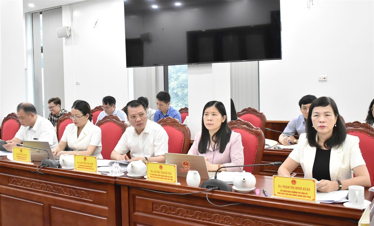 Đồng chí Phạm Thị Minh Xuân, Phó Chủ tịch HĐND tỉnh và đồng chí Lê Thị Thanh Trà, Phó Chủ tịch HĐND tỉnh cùng các đại biểu dự họp thẩm tra dự thảo nghị quyết trình Kỳ họp thứ hai (chuyên đề).
