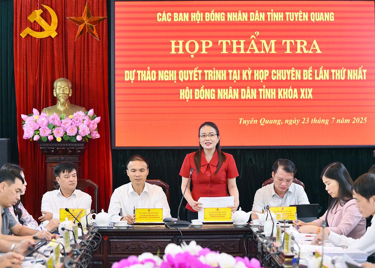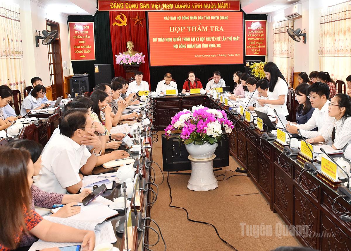 Các ban HĐND tỉnh cũng đã thẩm tra 10 dự thảo nghị quyết quan trọng sẽ trình tại kỳ họp chuyên đề lần thứ nhất, HĐND tỉnh khóa XIX, bao gồm: Giao dự toán thu ngân sách nhà nước, chi ngân sách địa phương và phương án phân bổ ngân sách cấp tỉnh năm 2025; Quy định phân cấp nguồn thu ngân sách nhà nước, nhiệm vụ chi ngân sách địa phương và tỷ lệ phần trăm (%) phân chia các khoản thu giữa ngân sách cấp tỉnh và ngân sách cấp xã trên địa bàn tỉnh năm 2025; Quy định chính sách hỗ trợ điều kiện đi lại và làm việc cho cán bộ, công chức, viên chức và người lao động của các cơ quan, tổ chức ở đơn vị hành chính thực hiện sắp xếp về công tác tại trung tâm hành chính của đơn vị hành chính cấp tỉnh trên địa bàn tỉnh Tuyên Quang khi thực hiện sắp xếp đơn vị hành chính; Quyết định Kế hoạch đầu tư công trung hạn vốn ngân sách địa phương giai đoạn 2021 - 2025, tỉnh Tuyên Quang (sau sắp xếp); Quyết định Kế hoạch đầu tư công vốn ngân sách địa phương năm 2025, tỉnh Tuyên Quang (sau sắp xếp); Giao cho Ủy ban nhân dân tỉnh quyết định việc điều chỉnh Kế hoạch đầu tư công trung hạn và hằng năm của cấp huyện vào Kế hoạch đầu tư công trung hạn và hằng năm của ngân sách cấp tỉnh hoặc Kế hoạch đầu tư công trung hạn và hằng năm của ngân sách cấp xã; Điều chỉnh chủ trương chuyển mục đích sử dụng rừng sang mục đích khác để thực hiện 02 Dự án thuộc lĩnh vực giao thông trên địa bàn tỉnh Tuyên Quang; Phê duyệt số lượng hợp đồng lao động thực hiện công việc chuyên môn, nghiệp vụ theo Nghị định số 111/2022 của Chính phủ đối với đơn vị sự nghiệp công lập thuộc lĩnh vực giáo dục và đơn vị sự nghiệp công lập thuộc lĩnh vực y tế năm 2025 do Nhà nước bảo đảm chi thường xuyên trên địa bàn tỉnh Tuyên Quang; Phê duyệt tạm thời tổng số biên chế công chức trong các cơ quan, tổ chức hành chính nhà nước tỉnh Tuyên Quang năm 2025 sau sáp nhập tỉnh; Phê duyệt tạm thời tổng số lượng người làm việc trong các đơn vị sự nghiệp công lập, tổ chức Hội của tỉnh Tuyên Quang năm 2025 sau sáp nhập tỉnh.