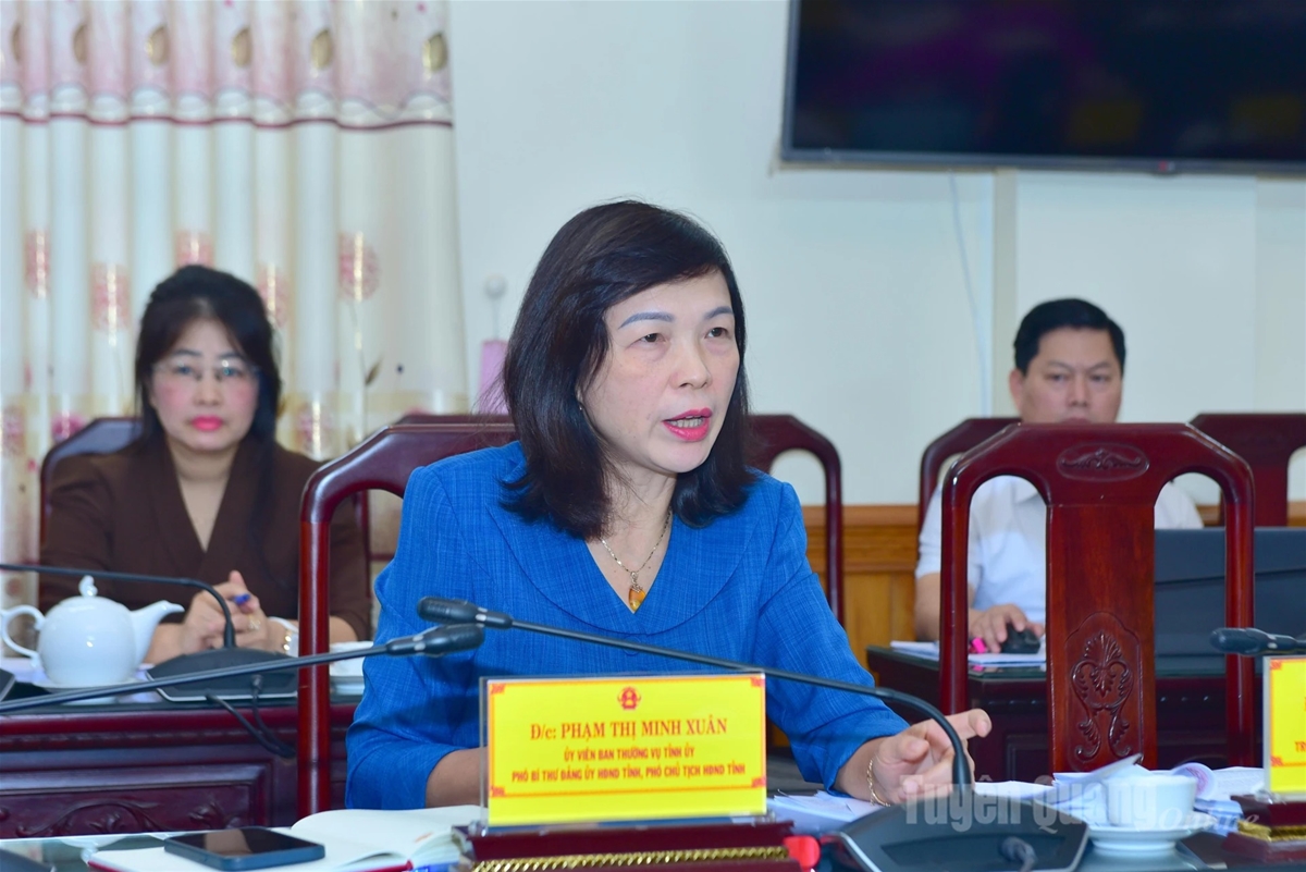 Đồng chí Phó Chủ tịch HĐND tỉnh Phạm Thị Minh Xuân cho ý kiến vào nội dung một số dự thảo nghị quyết.