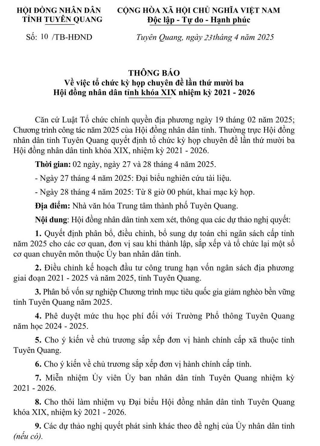 Phát biểu của đồng chí Nguyễn Văn Sơn, Phó Bí thư Tỉnh ủy, Chủ tịch Hội đồng nhân dân tỉnh tại phiên bế mạc Kỳ họp thứ hai Hội đồng nhân dân tỉnh khóa XIX.