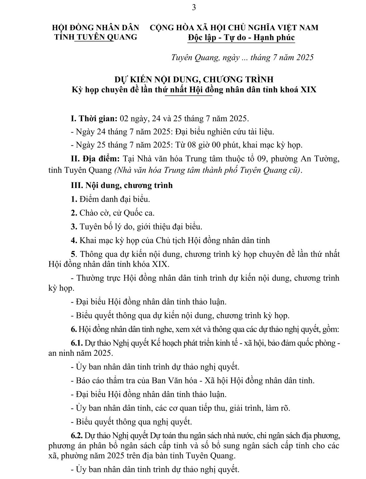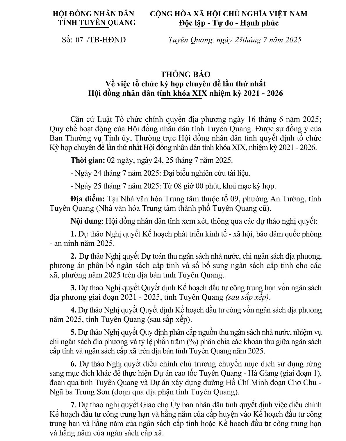 Thông báo tổ chức kỳ họp chuyên đề lần thứ nhất Hội đồng nhân dân tỉnh khóa XIX, nhiệm kỳ 2021 - 2026