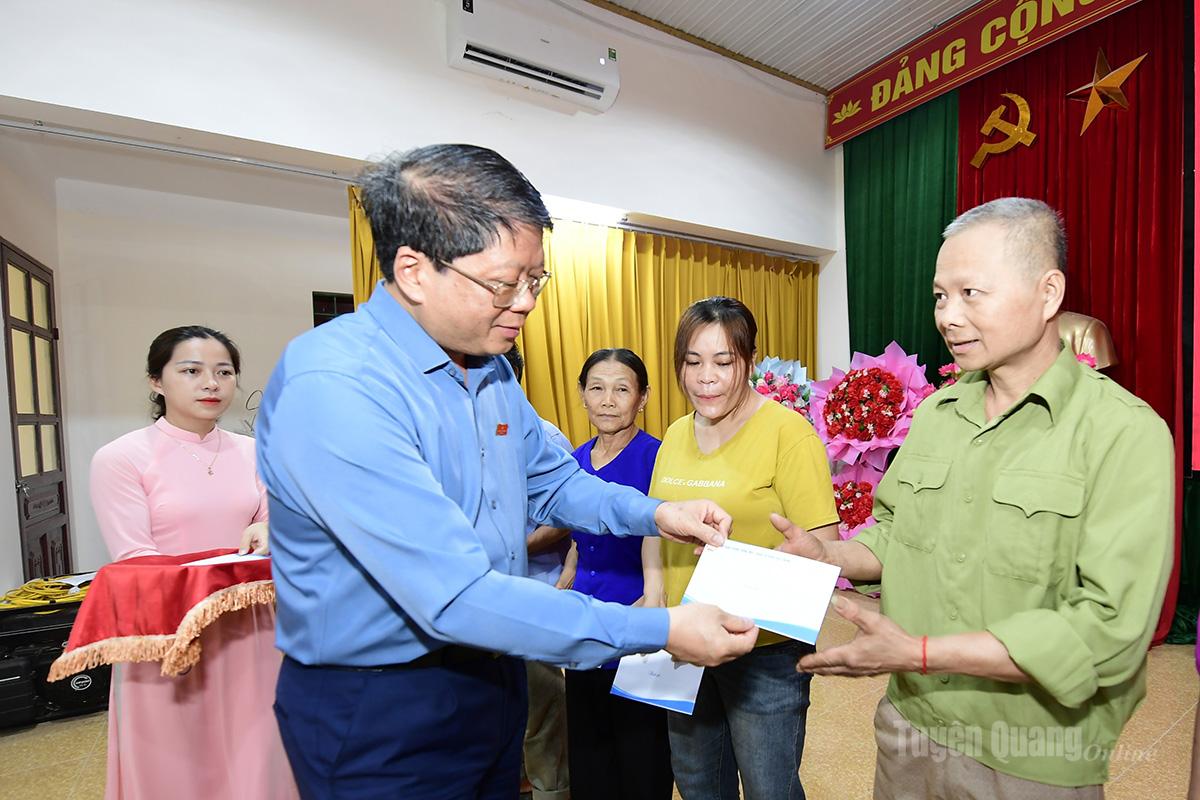 Đồng chí Hà Trung Kiên, Ủy viên Ban Thường vụ Tỉnh ủy, Phó Chủ tịch Thường trực Ủy ban MTTQ tỉnh trao quà của đồng chí Hà Thị Nga, Ủy viên BCH Trung ương Đảng, Phó Chủ tịch, Tổng thư ký Ủy ban MTTQ Việt Nam cho các gia đình hộ nghèo trên địa bàn xã Hòa An.