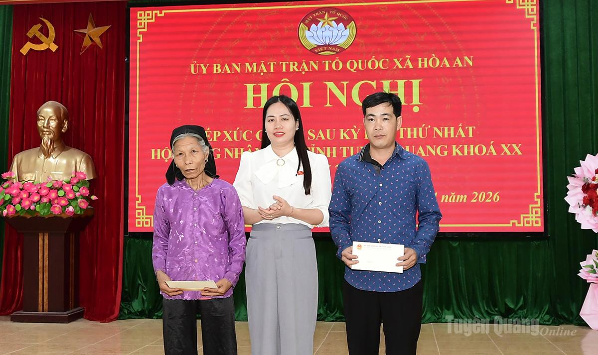 Nhân dịp này, Tổ đại biểu cùng lãnh đạo xã Hòa An đã trao 50 suất quà của đồng chí Hà Thị Nga, Ủy viên Ban Chấp hành Trung ương Đảng, Phó Chủ tịch, Tổng thư ký Ủy ban MTTQ Việt Nam và 03 suất quà của Tổ đại biểu số 03 HĐND tỉnh cho gia đình chính sách, gia đình có hoàn cảnh đặc biệt khó khăn và hộ nghèo, hộ cận nghèo trên địa bàn xã Hoà An./.