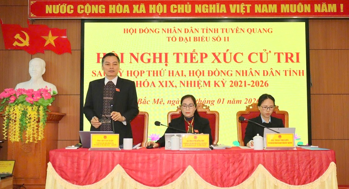 Tại hội nghị, Tổ đại biểu đã báo cáo với cử tri tri về kết quả Kỳ họp thứ hai HĐND tỉnh khóa XIX, nhiệm kỳ 2021 - 2026; tuyên truyền, thông tin đến cử tri các Nghị quyết đã được HĐND tỉnh ban hành; tuyên truyền về lịch trình bầu cử đại biểu Quốc hội khóa XVI và đại biểu HĐND các cấp nhiệm kỳ 2026 - 2031; Nghị quyết Đại hội đại biểu Đảng bộ tỉnh Tuyên Quang lần thứ I, nhiệm kỳ 2025 - 2030; Đại hội đại biểu toàn quốc lần thứ XIV của Đảng dự kiến diễn ra từ 19/01 đến 25/01/2026. Đồng thời, dành nhiều thời gian để cử tri bày tỏ tâm tư nguyện vọng, những đề xuất, kiến nghị.