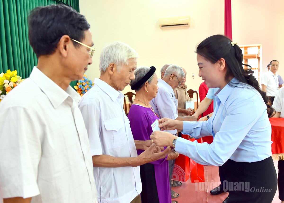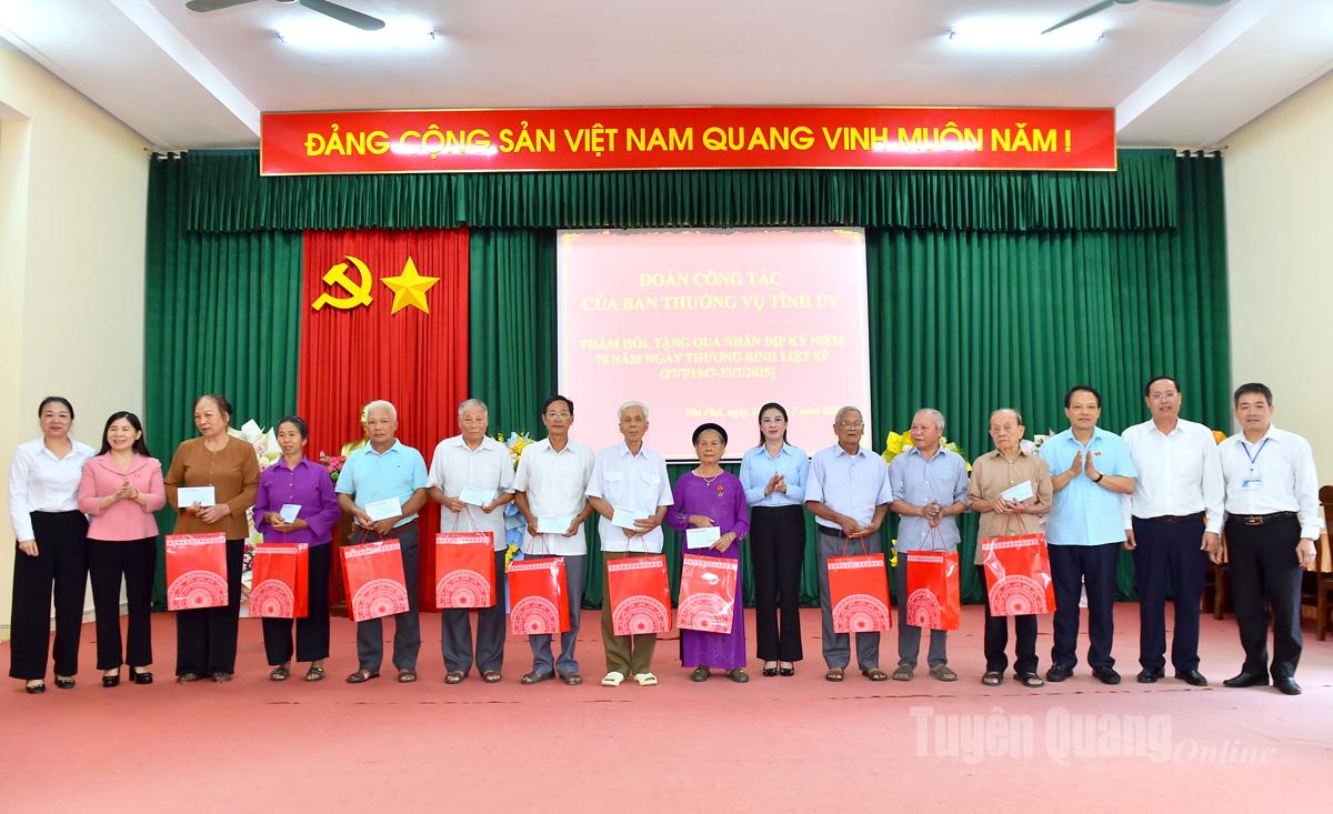 Đồng chí Lê Thị Kim Dung, Phó Bí thư Thường trực Tỉnh ủy và các đồng chí lãnh đạo tỉnh trao quà cho các thương bệnh binh, gia đình chính sách xã Yên Phú.