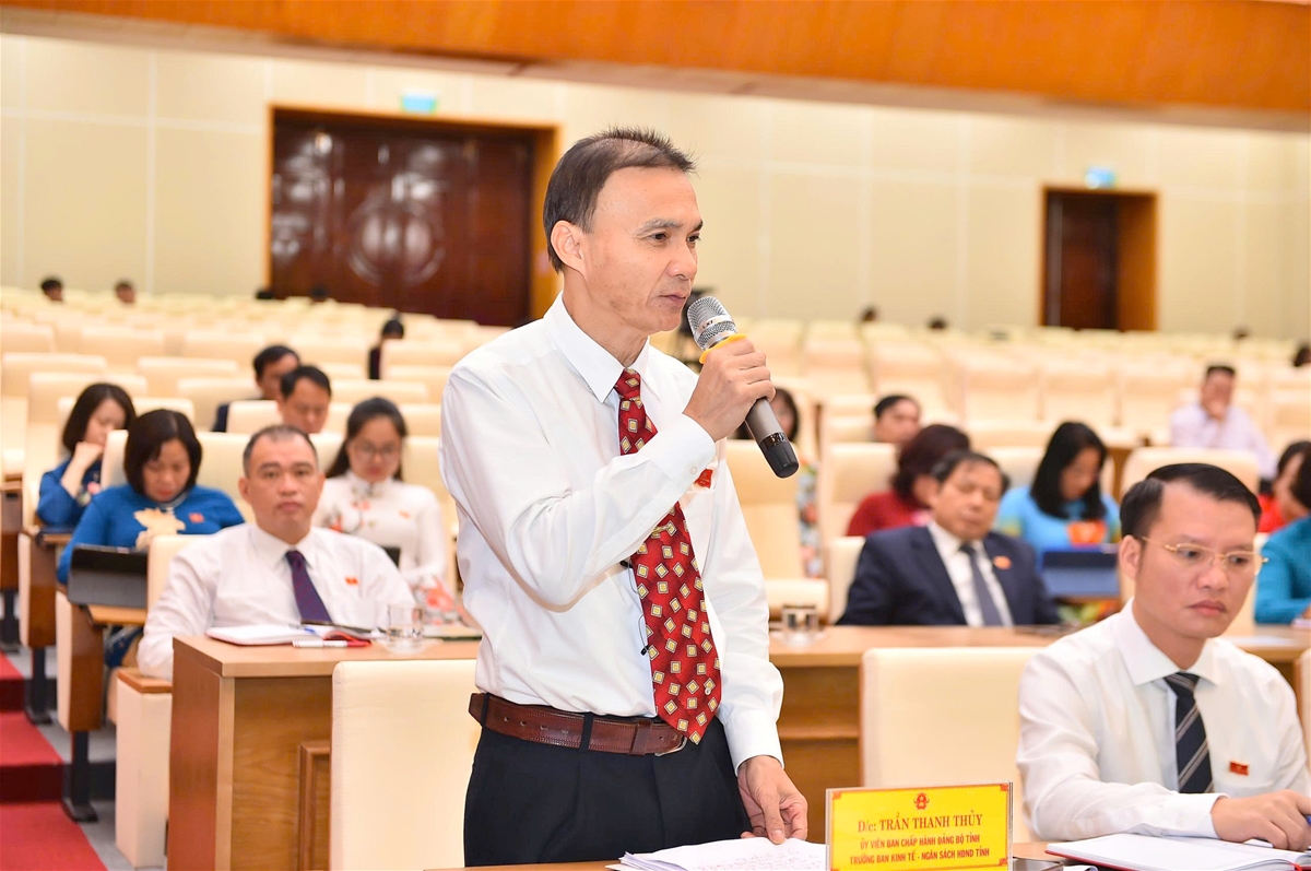 Trưởng Ban Kinh tế - Ngân sách HĐND tỉnh Trần Thanh Thủy phát biểu làm rõ một số nội dung thẩm tra nghị quyết được xem xét tại kỳ họp.