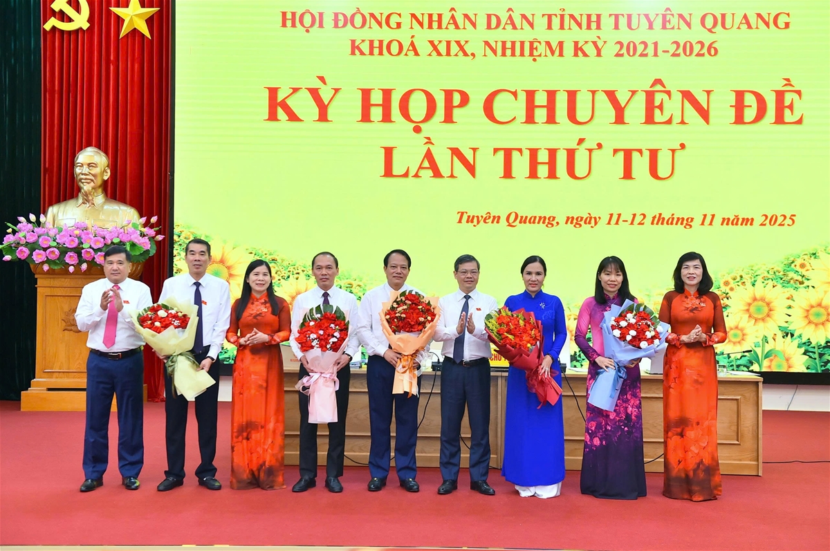 Các đồng chí lãnh đạo HĐND tỉnh tặng hoa các đồng chí vừa được miễn nhiệm và được bầu Ủy viên UBND tỉnh tại kỳ họp.