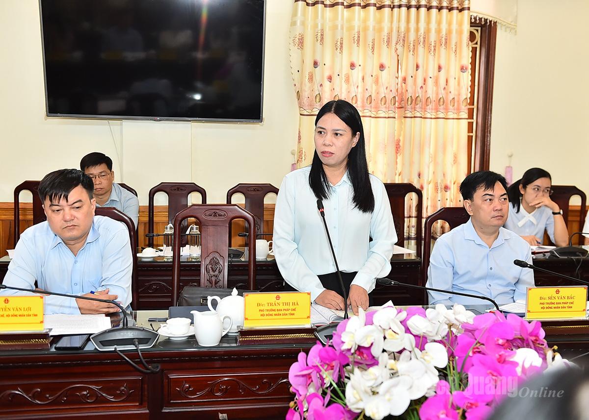 Đồng chí Trần Thị Hà, Phó Trưởng ban Pháp chế HĐND tỉnh phát biểu tại phiên họp.
