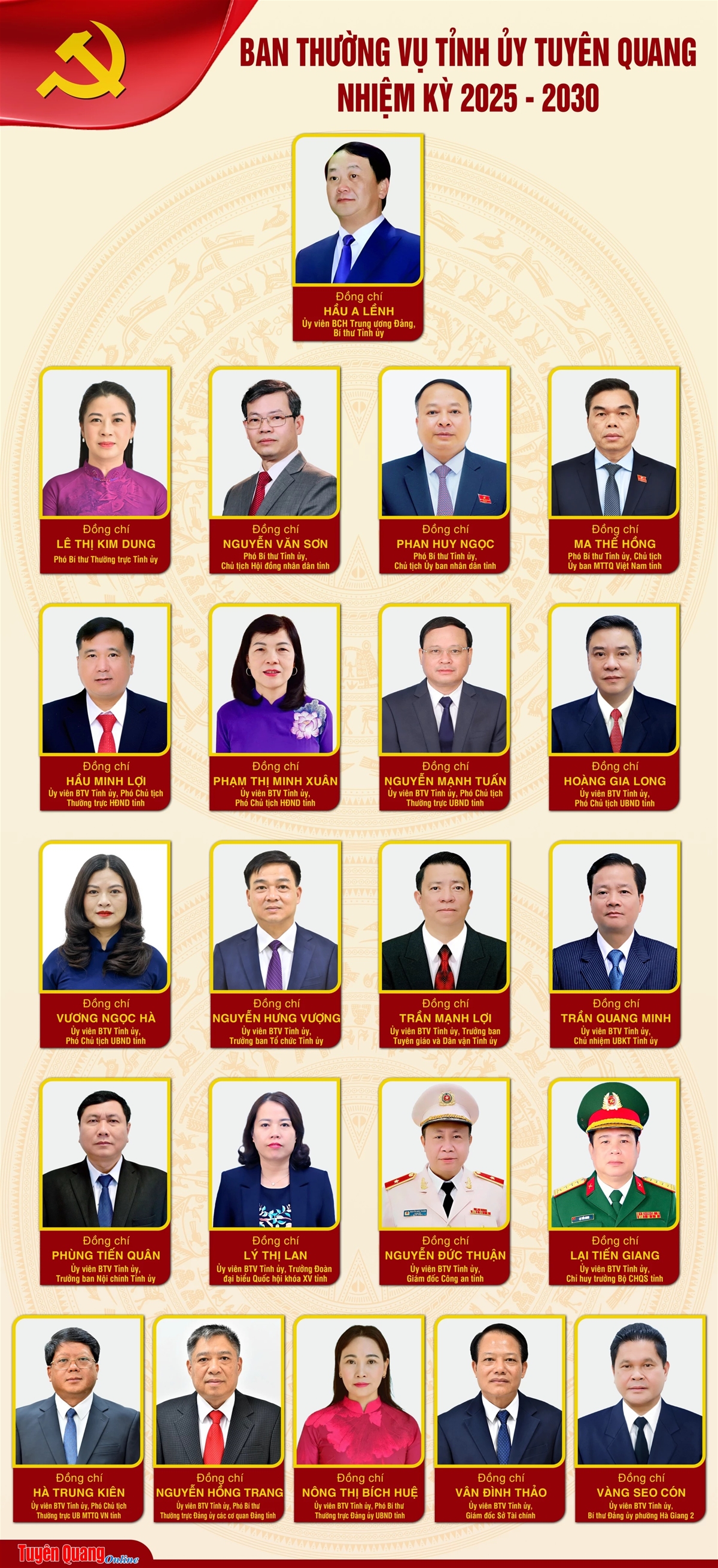 Ngày 24-9, tại phiên chính thức Đại hội đại biểu Đảng bộ tỉnh Tuyên Quang lần thứ I, nhiệm kỳ 2025-2030 đã thông báo Quyết định số 2325-QĐNS/TW, ngày 10/9/2025 của Bộ Chính trị chỉ định BCH Đảng bộ tỉnh Tuyên Quang nhiệm kỳ 2025-2030 gồm 68 đồng chí, Ban Thường vụ Tỉnh ủy Tuyên Quang nhiệm kỳ 2025-2030 gồm 22 đồng chí.