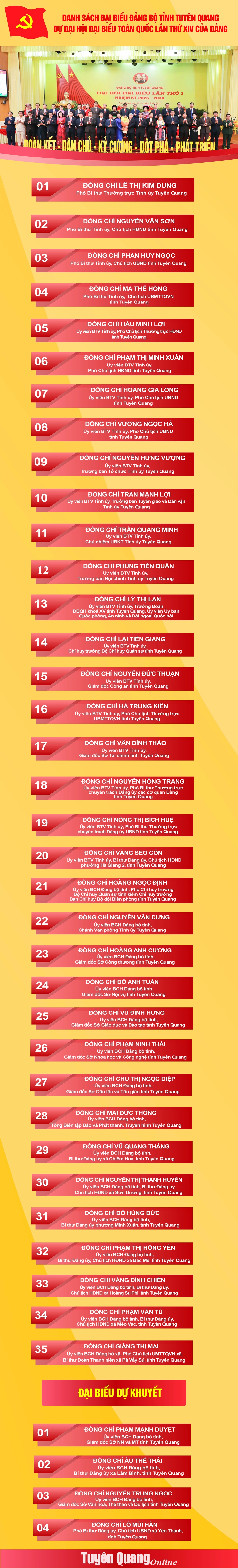 Ngày 24-9, tại phiên chính thức Đại hội đại biểu Đảng bộ tỉnh Tuyên Quang lần thứ I, nhiệm kỳ 2025-2030 đã thông báo Quyết định số 2330-QĐNS/TW, ngày 12/9/2025 của Bộ Chính trị chỉ định Đoàn đại biểu Đảng bộ tỉnh Tuyên Quang dự Đại hội đại biểu toàn quốc lần thứ XIV của Đảng, gồm 39 đồng chí, trong đó: 35 đại biểu chính thức và 4 đại biểu dự khuyết.