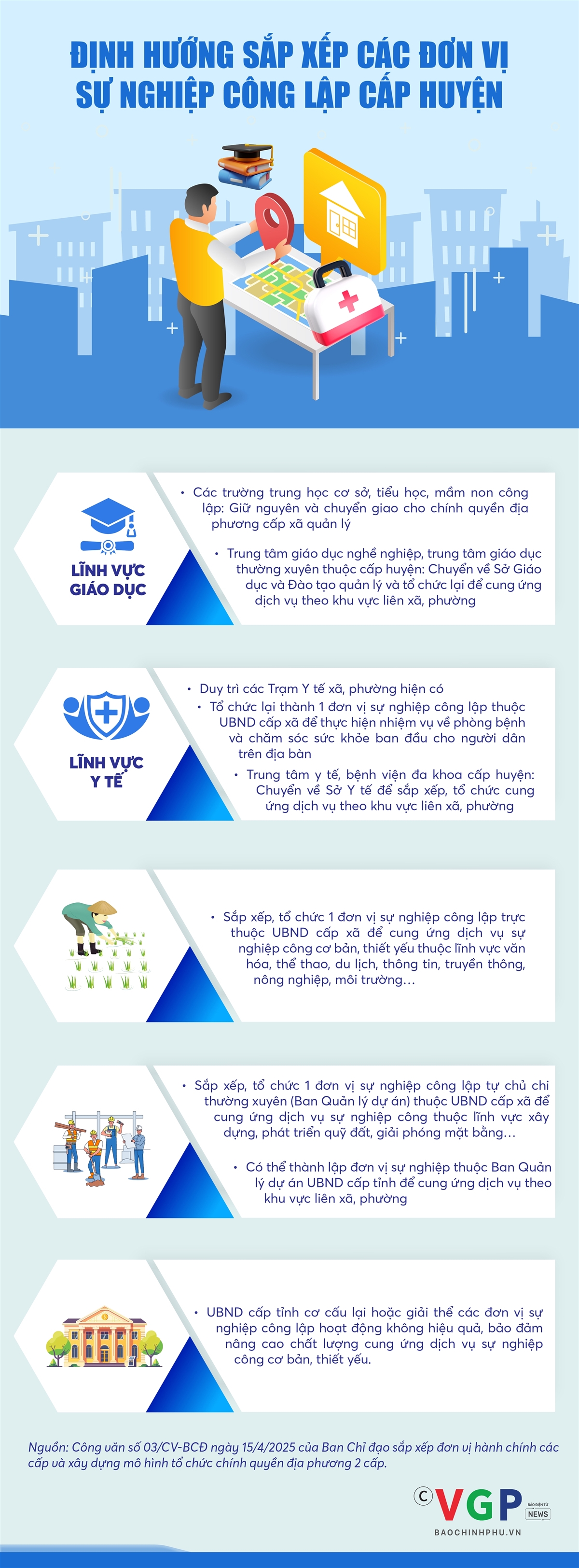 Theo Công văn số 03/CV-BCĐ của Ban Chỉ đạo sắp xếp đơn vị hành chính các cấp và xây dựng mô hình tổ chức chính quyền địa phương 2 cấp, nhiều đơn vị sự nghiệp công lập cấp huyện sẽ được chuyển giao cho cấp xã quản lý.