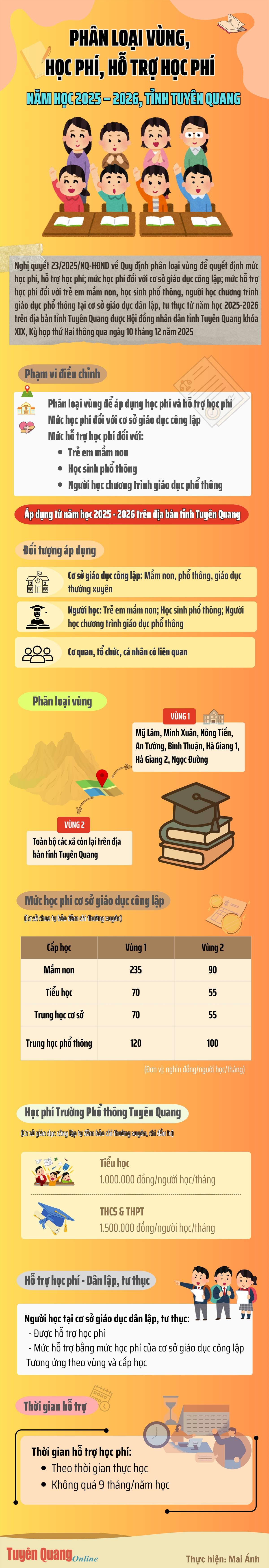 Phân loại vùng, học phí và hỗ trợ học phí năm học 2025 - 2026 của tỉnh Tuyên Quang