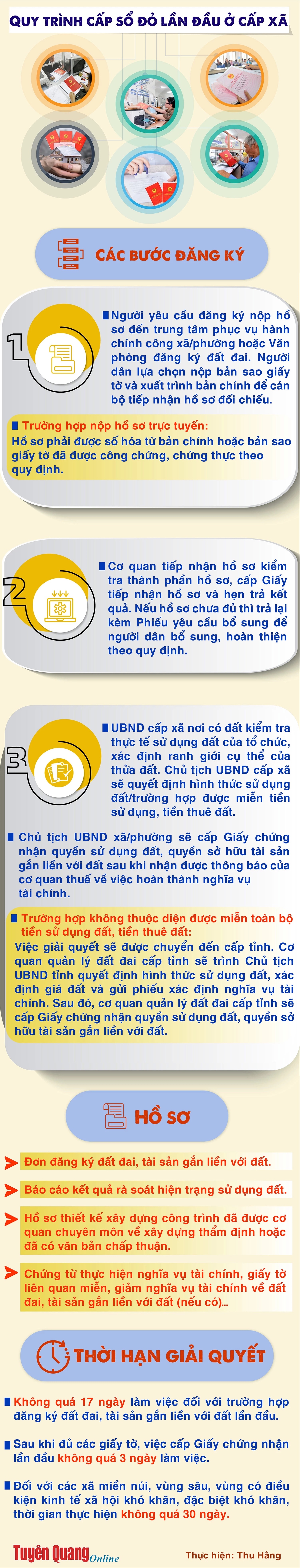 Thực hiện chính quyền địa phương hai cấp, Bộ Nông nghiệp và Môi trường nêu rõ 3 bước làm thủ tục đăng ký đất đai, tài sản gắn liền với đất, cấp Giấy chứng nhận quyền sử dụng đất, quyền sở hữu tài sản gắn liền với đất (sổ đỏ) lần đầu ở cấp xã.