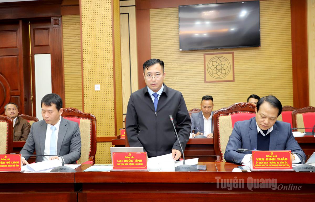 Chủ tịch Hiệp hội Du lịch tỉnh Lại Quốc Tĩnh báo cáo tại buổi làm việc.
