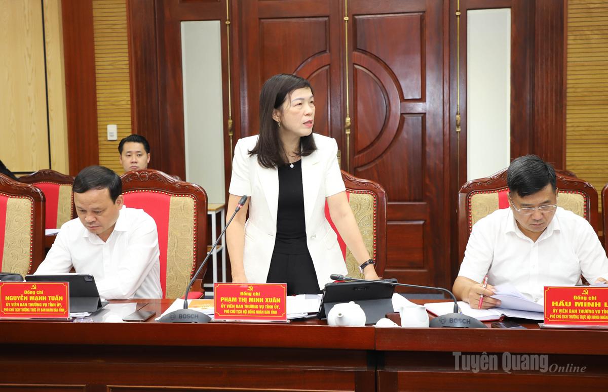 | Đồng chí Phó Chủ tịch HĐND tỉnh Phạm Thị Minh Xuân thảo luận tại hội nghị. |