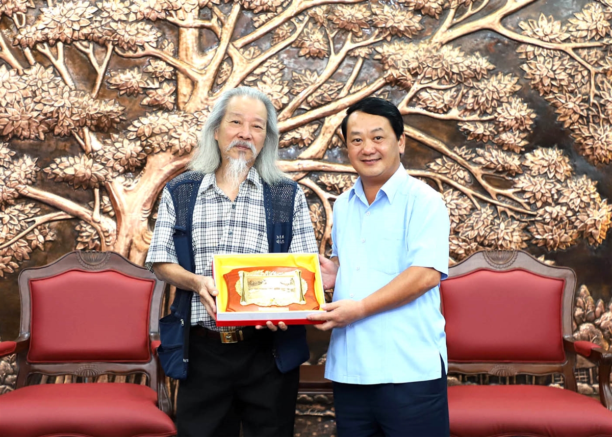 Bí thư Tỉnh ủy Hầu A Lềnh trao tặng con trai cố Nhạc sĩ Văn Cao quà lưu niệm của tỉnh Tuyên Quang.