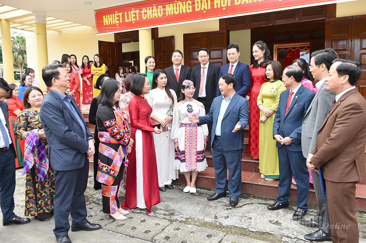 Đồng chí Bí thư Tỉnh ủy Hầu A Lềnh nói chuyện với các thầy cô giáo, học viên Trường Chính trị tỉnh.