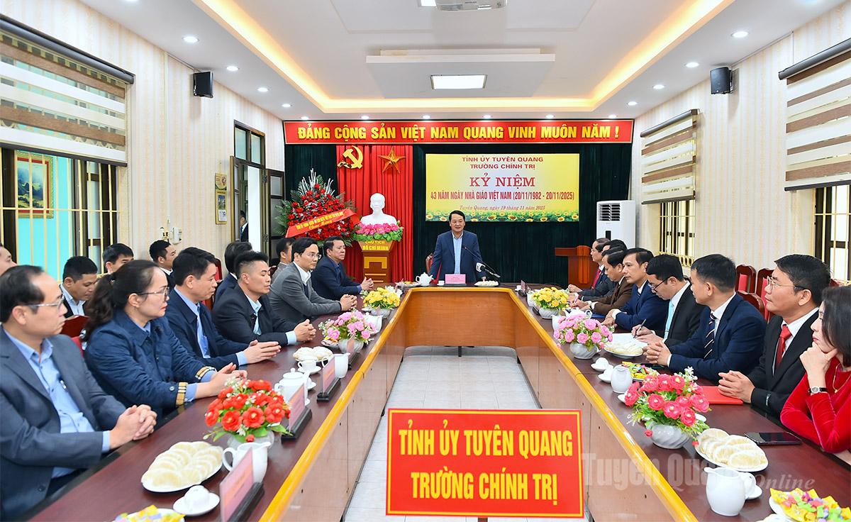 Thay mặt tập thể nhà trường, lãnh đạo Trường Chính trị tỉnh bày tỏ sự trân trọng cảm ơn sự quan tâm sâu sắc của Thường trực Tỉnh ủy và cá nhân đồng chí Bí thư Tỉnh uỷ, đặc biệt là những chỉ đạo quan trọng trong buổi làm việc đầu tháng 11-2025 về đào tạo, bồi dưỡng cán bộ; nghiên cứu khoa học lý luận chính trị; xây dựng đội ngũ giảng viên và đầu tư xây dựng cơ sở vật chất của trường.