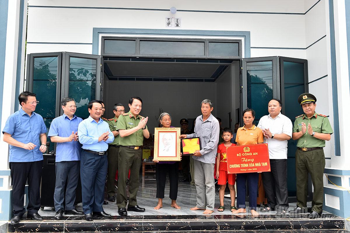 Đại tướng Lương Tam Quang, Bộ trưởng bộ Công an và các đồng chí lãnh đạo tỉnh trao hỗ hợ nhà và quà cho gia đình ông Nguyễn Văn Luận tại thôn Toa, xã Minh Thanh.