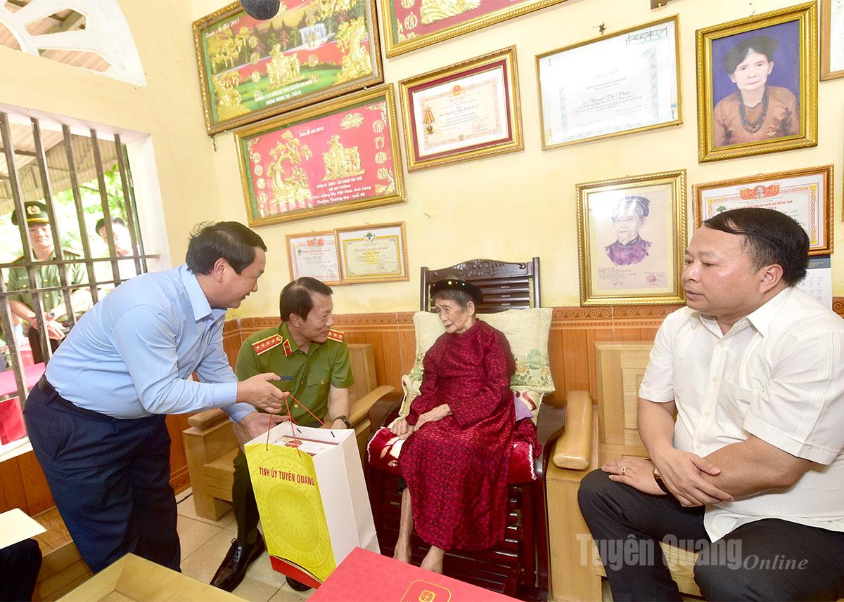 Bộ trưởng Bộ Công an Lương Tam Quang và các đồng chí lãnh đạo tỉnh nói chuyện với Mẹ Việt Nam Anh hùng Nguyễn Thị Nhớn.