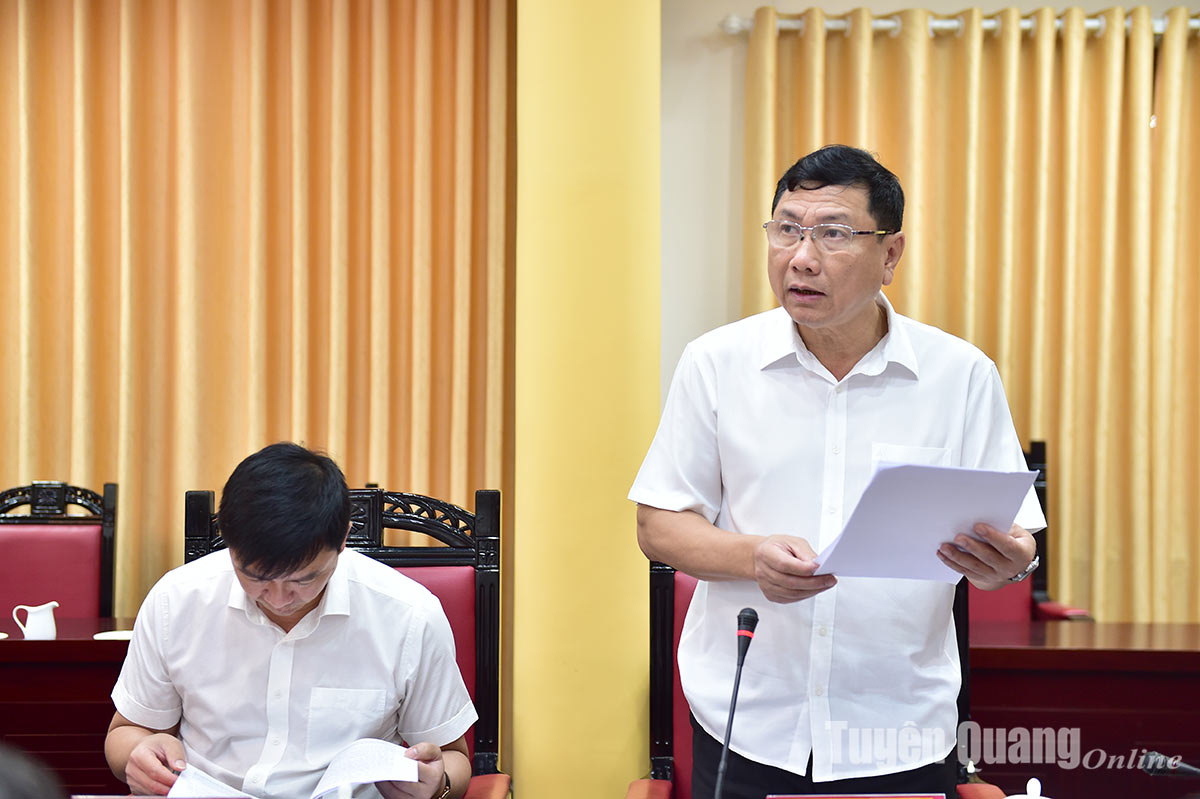 Đồng chí Trưởng Ban Nội chính Tỉnh ủy, Trưởng Ban Pháp chế HĐND tỉnh Phùng Tiến Quân quán triệt một số văn bản của Trung ương tại phiên họp.