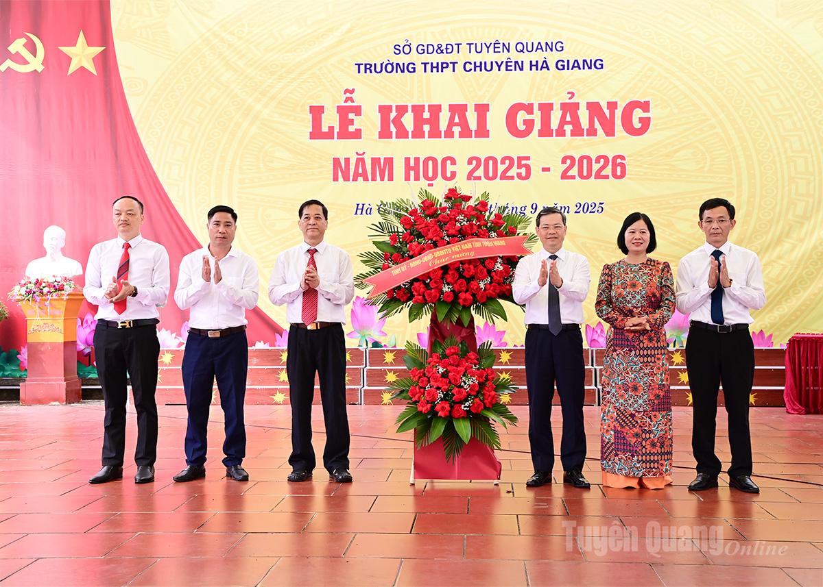 Đồng chí Chủ tịch HĐND tỉnh Nguyễn Văn Sơn tặng hoa chúc mừng thầy và trò Trường THPT Chuyên Hà Giang nhân Lễ khai giảng năm học mới.