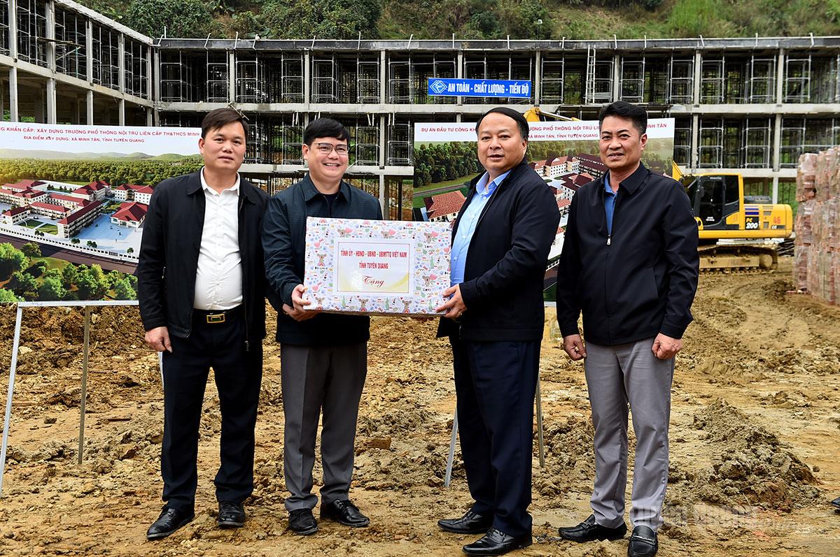 Đồng chí Chủ tịch UBND tỉnh Phan Huy Ngọc tặng quà công nhân thi công công trình trường Phổ thông nội trú liên cấp Tiểu học và Trung học cơ sở Phố Bảng.