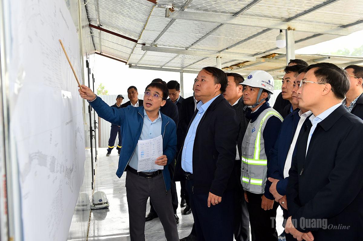 Kiểm tra thực tế tại công trường, Chủ tịch UBND tỉnh Phan Huy Ngọc ghi nhận và biểu dương tinh thần làm việc của các đơn vị thi công, lực lượng kỹ sư, công nhân đã nỗ lực khắc phục khó khăn, duy trì tiến độ dự án ngay trong dịp đầu Xuân.
