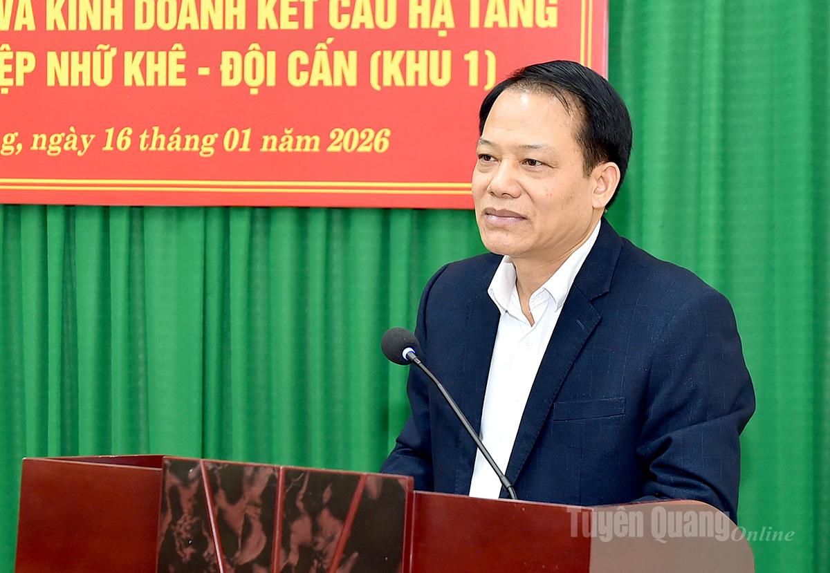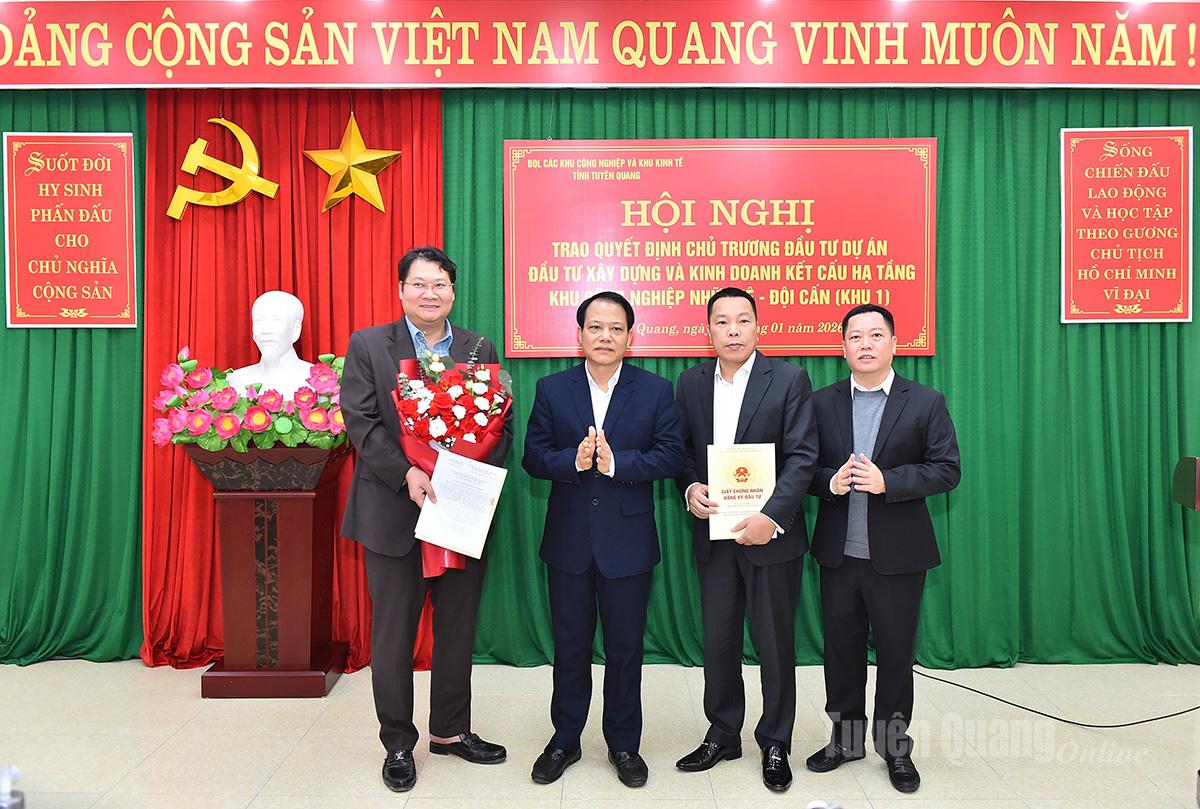 Tại hội nghị, Ban Quản lý các khu công nghiệp và khu kinh tế tỉnh đã công bố Quyết định số 86/QĐ-UBND ngày 14/01/2026 của UBND tỉnh Tuyên Quang về việc chấp thuận chủ trương đầu tư, đồng thời chấp thuận nhà đầu tư; trao Giấy chứng nhận đăng ký đầu tư cho Công ty TNHH Xây dựng Tự Lập thực hiện Dự án đầu tư xây dựng và kinh doanh kết cấu hạ tầng Khu công nghiệp Nhữ Khê - Đội Cấn (Khu 1). Dự án Đầu tư xây dựng và kinh doanh kết cấu hạ tầng Khu công nghiệp Nhữ Khê - Đội Cấn (Khu 1) có quy mô sử dụng đất khoảng 75 ha, được triển khai tại phường Bình Thuận, tỉnh Tuyên Quang. Tổng vốn đầu tư của dự án là 894,94 tỷ đồng, trong đó vốn góp của nhà đầu tư là 134,94 tỷ đồng, còn lại là vốn huy động. Thời hạn hoạt động của dự án là 50 năm kể từ ngày được Nhà nước bàn giao đất.