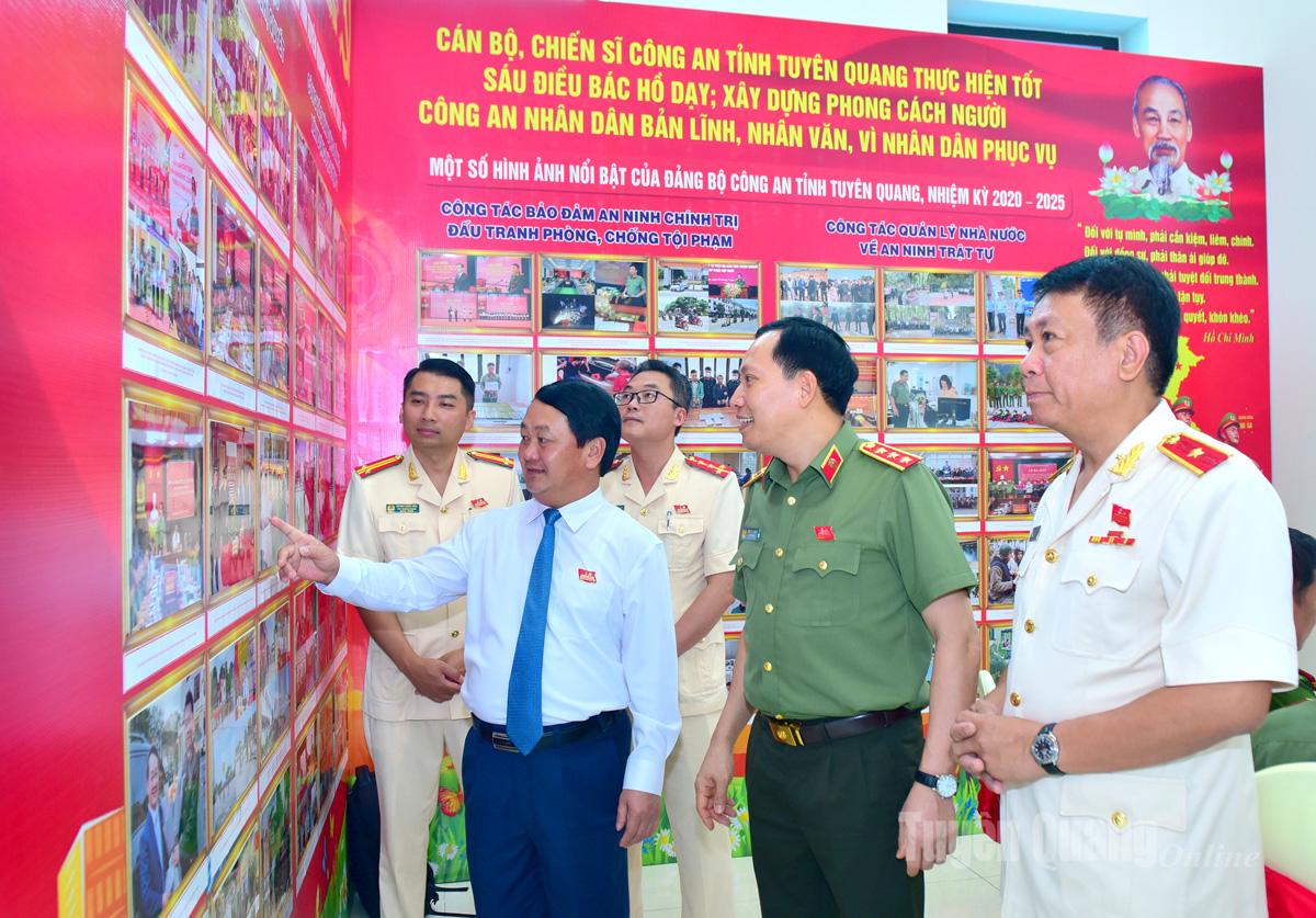 Các đồng chí: Bí thư Tỉnh uỷ Hầu A Lềnh, Thứ trưởng Bộ Công an Lê Văn Tuyến tham quan gian trưng bày hình ảnh nổi bật của lực lượng Công an tỉnh Tuyên Quang.