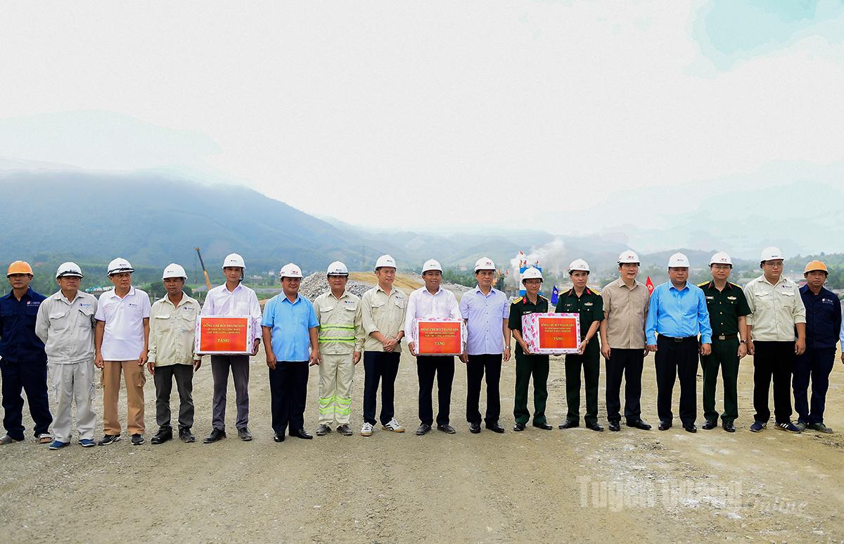 Đồng chí Phó Thủ tướng Chính phủ Bùi Thanh Sơn và các đồng chí lãnh đạo tỉnh tặng quà cho cán bộ, công nhân thi công cao tốc Tuyên Quang - Hà Giang.