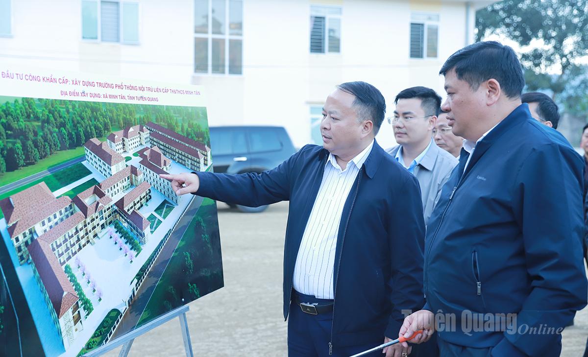 Đồng chí Phan Huy Ngọc, Phó Bí thư Tỉnh ủy, Chủ tịch UBND tỉnh kiểm tra sơ đồ phối cảnh thiết kế xây dựng Trường Phổ thông Dân tộc nội trú Tiểu học và THCS Minh Tân.