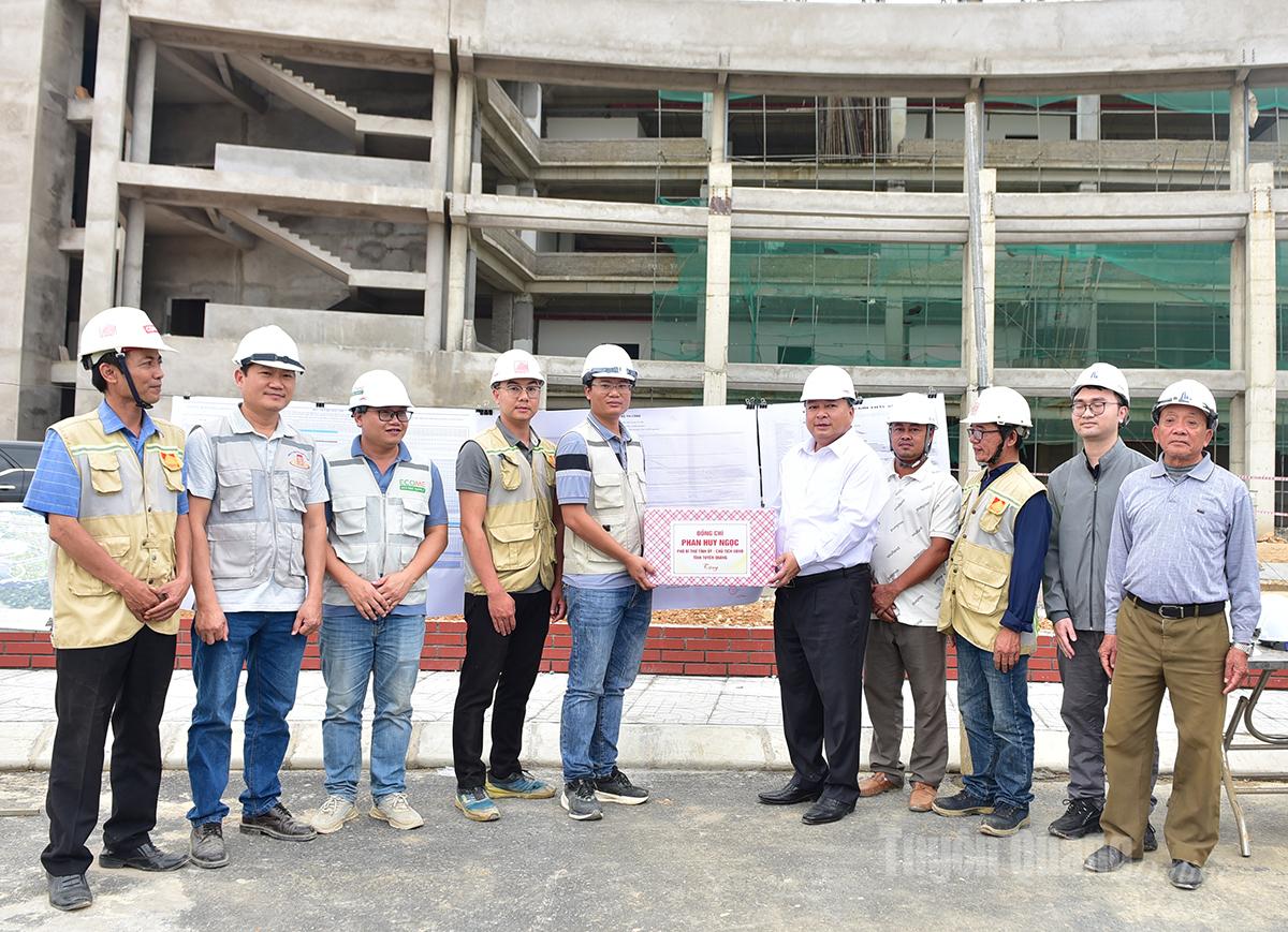 Chủ tịch UBND tỉnh Phan Huy Ngọc tặng quà, động viên cán bộ kỹ thuật, công nhân đang thi công trên công trường.
