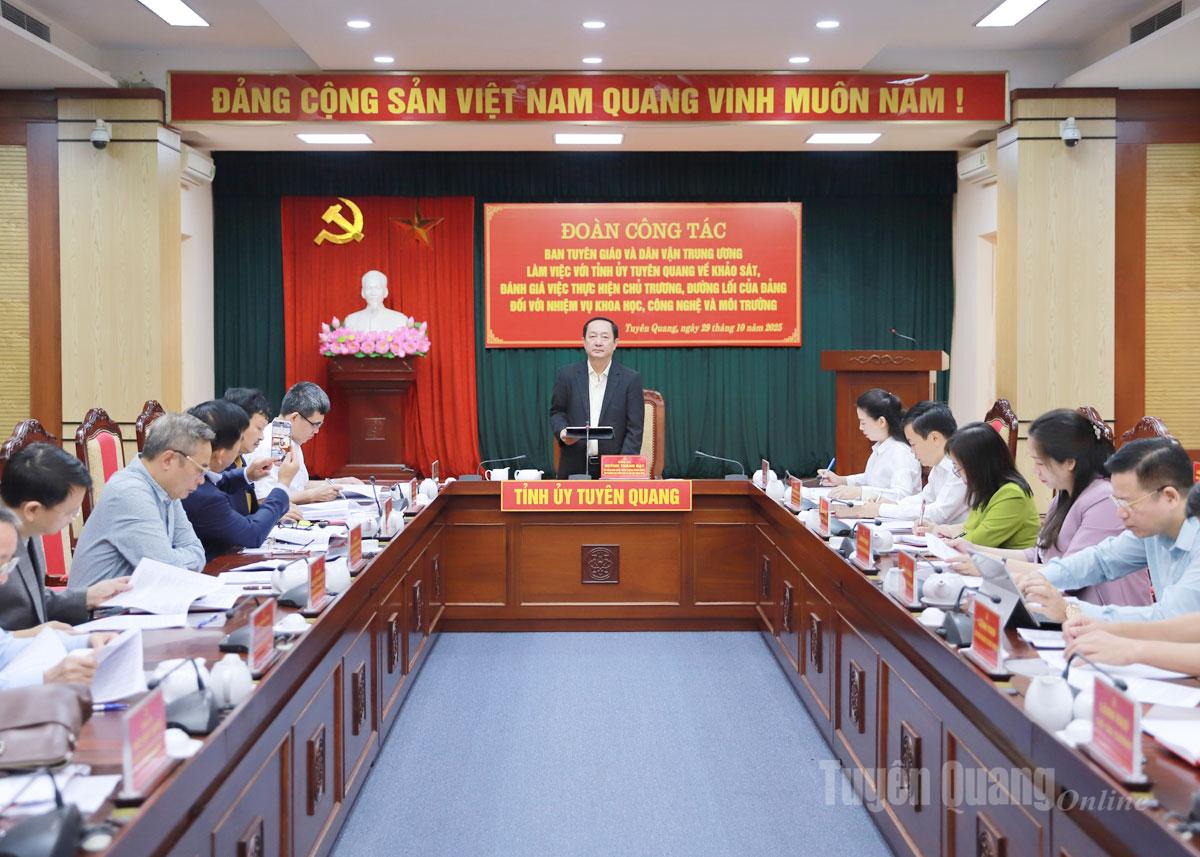 Phó Bí thư Thường trực Tỉnh ủy mong muốn Ban Tuyên giáo Trung ương và các bộ, ngành giúp kết nối các nhà khoa học hỗ trợ tỉnh trong ứng dụng khoa học, công nghệ vào các lĩnh vực kinh tế, xã hội, nhất là trong phát triển nông, lâm nghiệp để Tuyên Quang tìm ra lối đi riêng phù hợp với định hướng của Trung ương. Đồng chí đề xuất các bộ, ngành Trung ương có giải pháp căn cơ, dài hạn, bền vững hỗ trợ tỉnh trong ứng phó với biến đổi khí hậu, khai thác tiềm năng lâm nghiệp, bán tín chỉ carbon, xử lý rác thải sinh hoạt và thu gom, xử lý bao gói, vỏ thuốc bảo vệ thực vật; hỗ trợ nguồn lực trang thiết bị đáp ứng yêu cầu chuyển đổi số ở cơ sở.