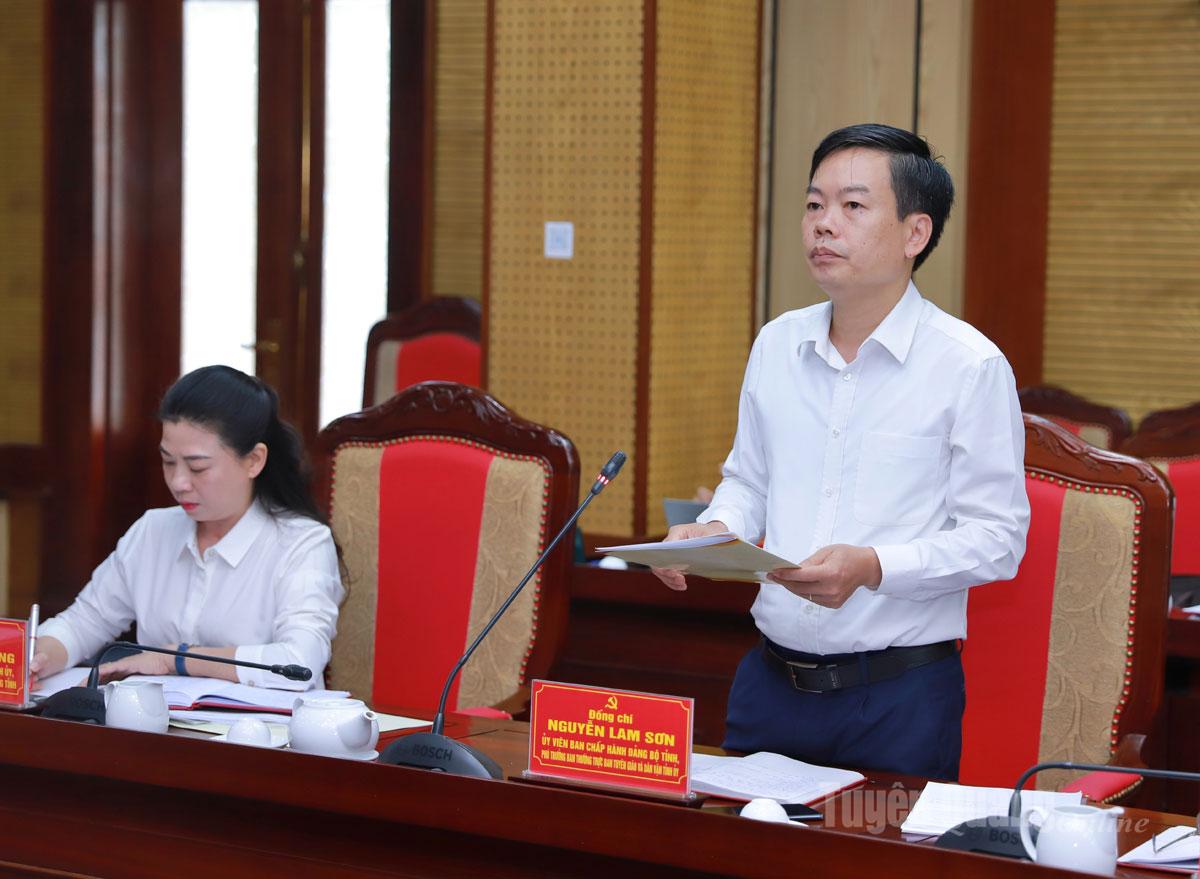 Phó Trưởng ban Thường trực Ban Tuyên giáo và Dân vận Tỉnh uỷ Nguyễn Lam Sơn báo cáo tình hình thực hiện Nghị quyết số 57 và Kết luận số 81 của tỉnh.