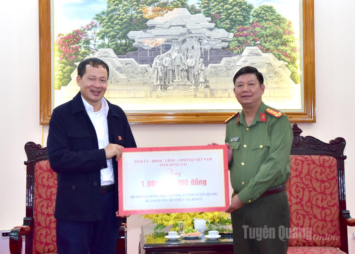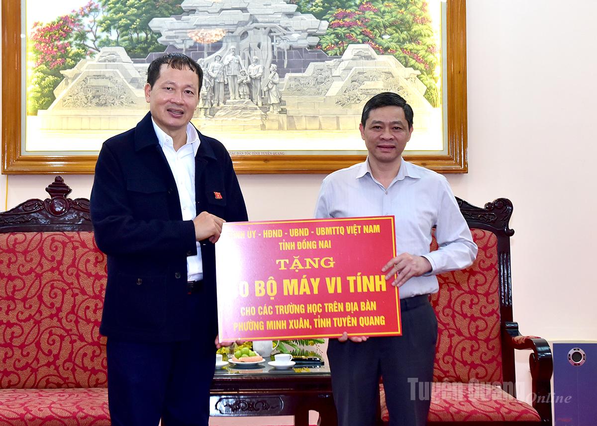 Tại buổi làm việc, Đoàn công tác tỉnh Đồng Nai đã trao tặng 10 tỷ đồng hỗ trợ tỉnh Tuyên Quang khắc phục thiệt hại do bão số 10, mưa lũ gây ra. Nhân dịp này, tỉnh Đồng Nai cũng tặng 1 tỷ đồng hỗ trợ các gia đình cán bộ, chiến sĩ Công an tỉnh Tuyên Quang chịu ảnh hưởng bởi bão, lũ; tặng 15 bộ máy vi tính cho các trường học ở các xã Nấm Dẩn, Trung Thịnh, Quảng Nguyên và tặng 40 bộ máy vi tính cho các trường học phường Minh Xuân.