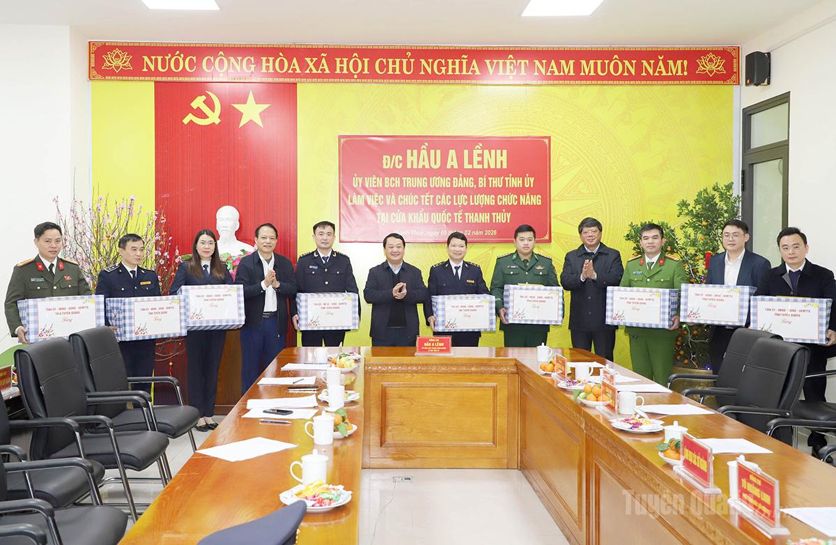 Tặng quà, chúc Tết các đơn vị, đồng chí Bí thư Tỉnh ủy ghi nhận, biểu dương những nỗ lực của lực lượng Biên phòng, Hải quan, Công an và các đơn vị liên ngành trong thực hiện nhiệm vụ bảo vệ chủ quyền biên giới quốc gia, giữ vững an ninh trật tự, tạo điều kiện thuận lợi cho hoạt động xuất nhập khẩu, xuất nhập cảnh. Đồng chí đề nghị Ban Quản lý các khu công nghiệp và khu kinh tế tỉnh tiếp tục quan tâm công tác quy hoạch, đầu tư hạ tầng giao thông kết nối; sắp xếp, tổ chức hạ tầng khu vực liên ngành đồng bộ, khoa học, xây dựng Cửa khẩu quốc tế Thanh Thủy ngày càng phát triển.