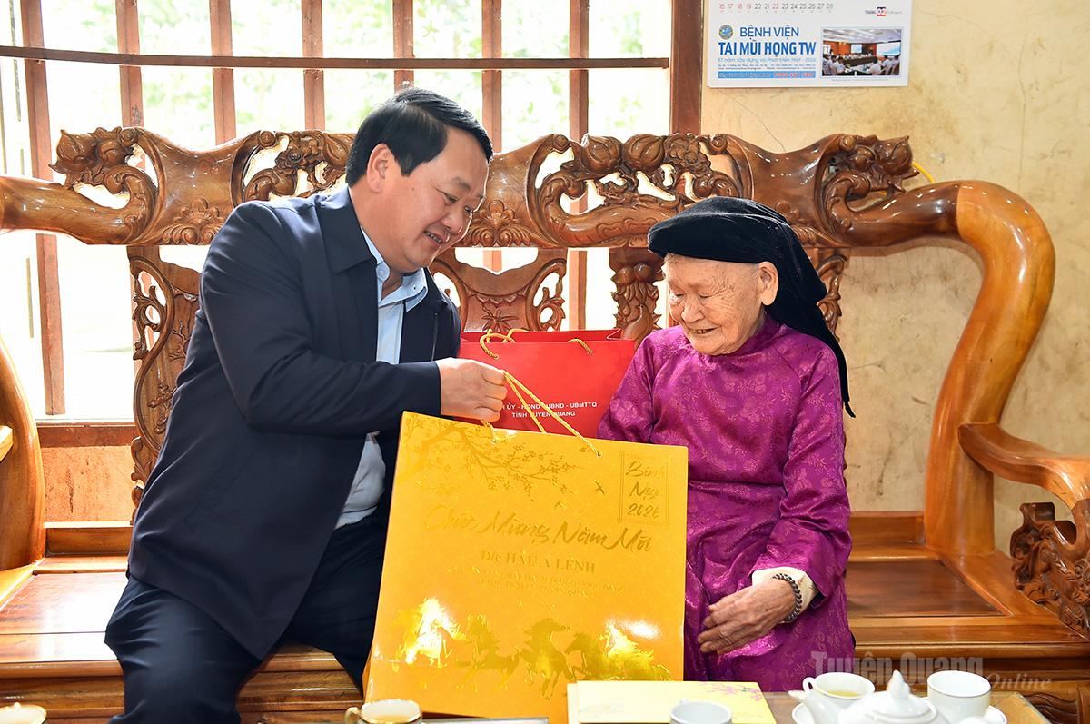 Bí thư Đảng ủy phường Minh Xuân Đỗ Hùng Đức tặng quà, chúc Tết Mẹ Việt Nam Anh hùng Lâm Thị Giã.