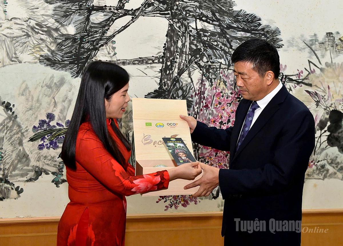 Đồng chí Phó Chủ tịch HĐND tỉnh Lê Thị Thanh Trà tặng quà đồng chí Phương Xuân Minh, Phó Chủ nhiệm Thường trực Ban Thường vụ Đại hội đại biểu nhân dân Khu tự trị dân tộc Choang Quảng Tây.
