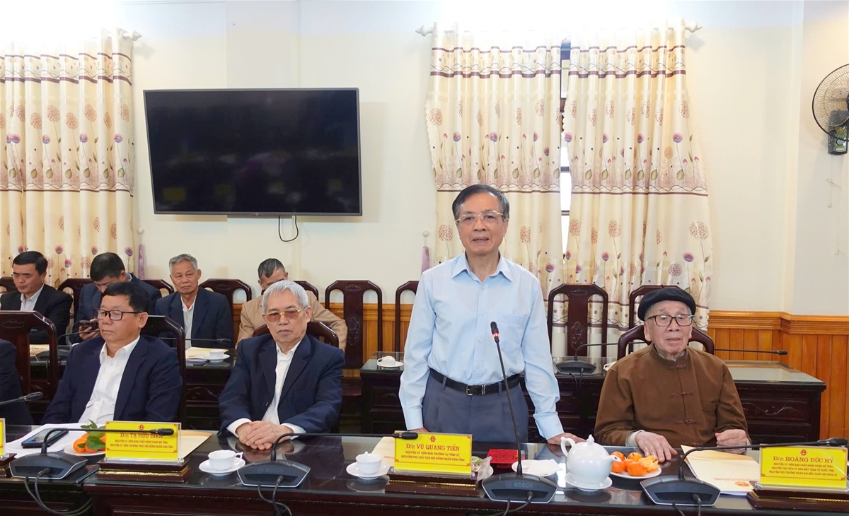 Đồng chí Vũ Quang Tiến, Nguyên Ủy viên Ban Thường vụ Tỉnh Ủy, nguyên Phó Chủ tịch Thường trực HĐND tỉnh phát biểu tại buổi gặp mặt.